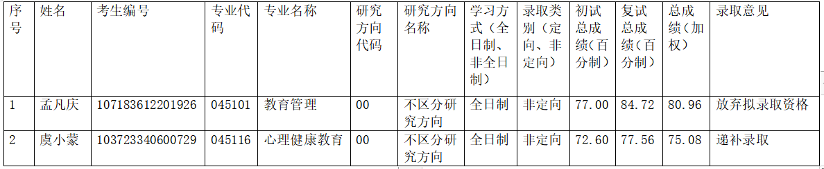 根据公司2023年硕士研究生复试录取工作实施方案,结合学科专业发展需要和本专业一志愿考生复试录取结果,经公司招生工作领导小组研究同意,教育管理专业孟凡庆考生放弃拟录取资格,心理健康教育专业获得1名调配指标,按照考生总成绩由高到低排序递补拟录取虞小蒙考生为心理健康教育专业硕士研究生。