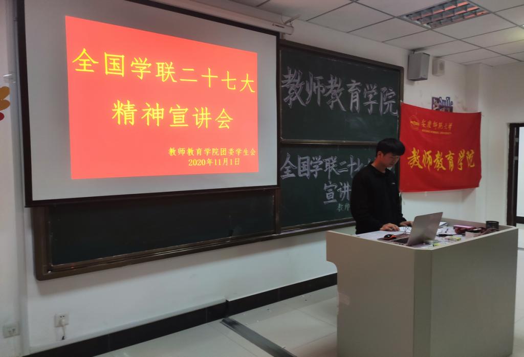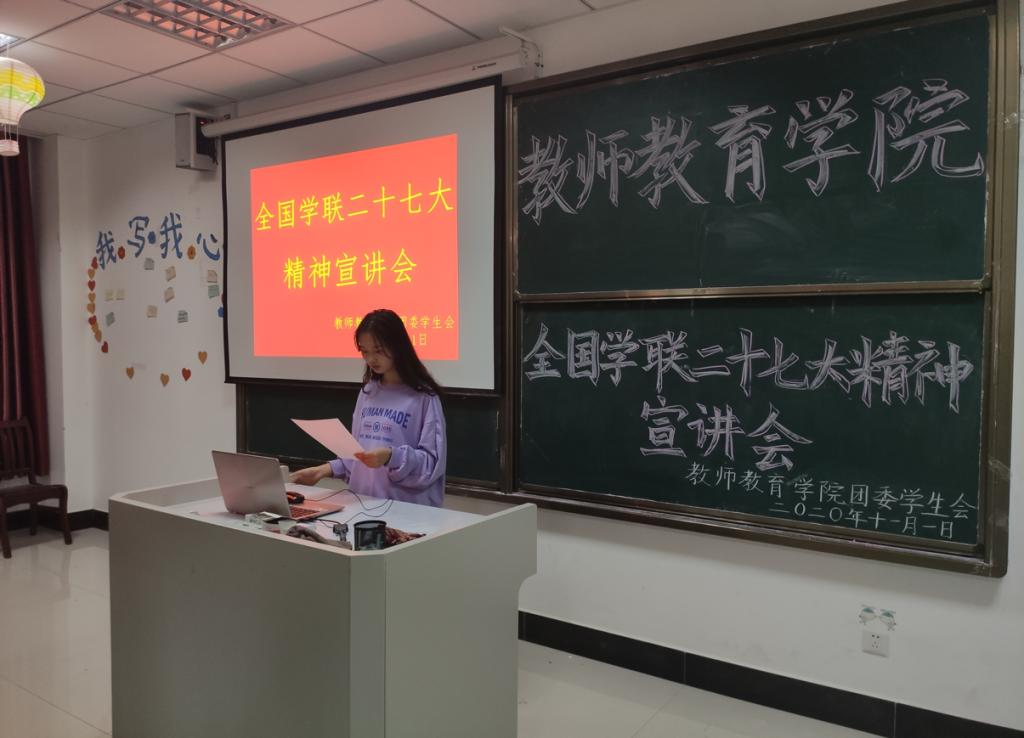 11月1日下午5:30,教师教育公司全国学联二十七大精神宣讲会在J221教室召开,员工会全体大二大三成员出席会议。会议由2019级小学教育(2)班汪倩主持,2018级小学教育(1)班姜宁宣讲全国学联二十七大的相关精神。
