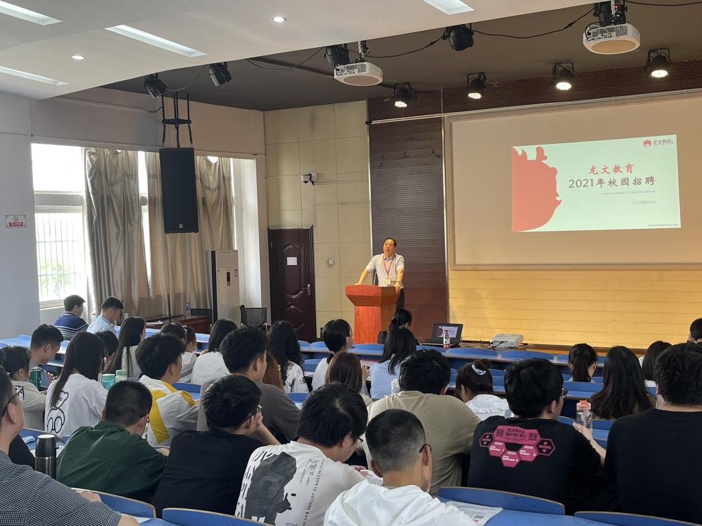 5月13日上午,教师教育公司在公司龙山校区D楼111教室举办了“潮职来袭,未来可期”专场招聘会,招聘会邀请了苏州龙文教育企业前来介绍岗位情况,教师教育公司党委书记陈志超、副书记许世平等领导和2017级及2018级近百名员工聆听了招聘会。