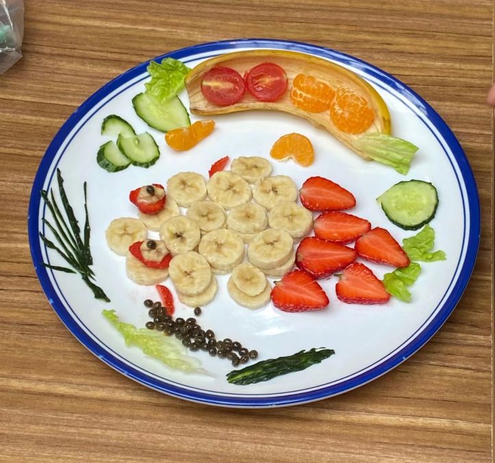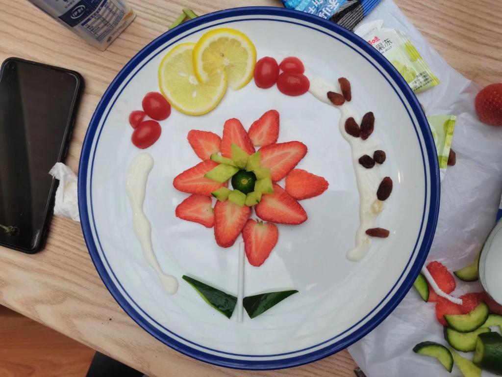参赛队伍有“建党100周年队”“红色革命队”“阳光之下队”等等,比赛开始,队伍内部分工明确,有条不紊的洗菜,洗餐具,分类摆放食材,点火……“建党100周年队”做的是水果摆盘,主厨进行图案设计,副厨负责水果切片,思路清晰,效率极高。各队的作品生动有趣,色香味俱全,令人垂涎三尺。