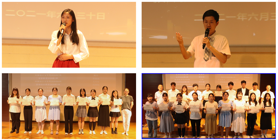 在6月30日下午的师德演讲校级决赛中,课程组特邀请了公司2020年“三全育人”最美教师曹长德老师、校“天柱学者”诸园老师、校青年教学大赛一等奖获得者陈修梅老师、校公共教育学教研室主任方玉芬老师等担任比赛评委。有来自全校2020级不同师范专业的17位选手参加了校级师德主题演讲比赛,他们紧扣师德师风主题,精选师德感人事迹,讴歌新时代教师职业道德风尚,并用饱满的精神状态展现了师范生积极昂扬的风采。最终评选出校级师德演讲比赛一等奖3名,二等奖6名,三等奖8名。在师德课程结业颁奖活动中,课程组老师依次揭晓优秀师德主题征文30篇、优秀特色主题班会设计方案4份、师德实践活动先进个人5名、师德课程学习之星10名、师德师风先进班集体14个、优秀课程助理20名和师德主题演讲优秀奖17名。