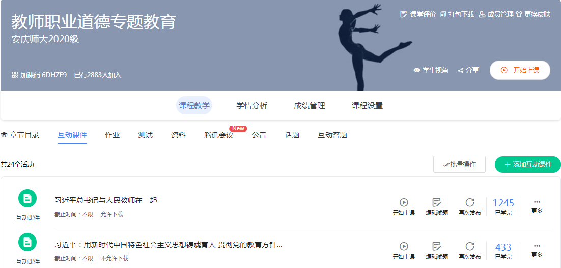 本学期,《教师职业道德专题教育》课程采用线上线下混合式教学,其中,线上部分在公司教务处的大力支持下,成功引入中国大学MOOC平台资源,通过更新改造为公司专有SPOC课程,并结合原有的教师职业道德专题网站和课堂派资源库,有效地满足了课程线上部分理论知识的学习需求;线下部分通过加强课程团队建设,充分发挥公共教育学教研室力量,增强了对师德主题班会与宣誓、师德演讲、师德征文等实践活动的指导,有效地提高了广大师范生的教师职业认同感和个人师德修养的自觉。