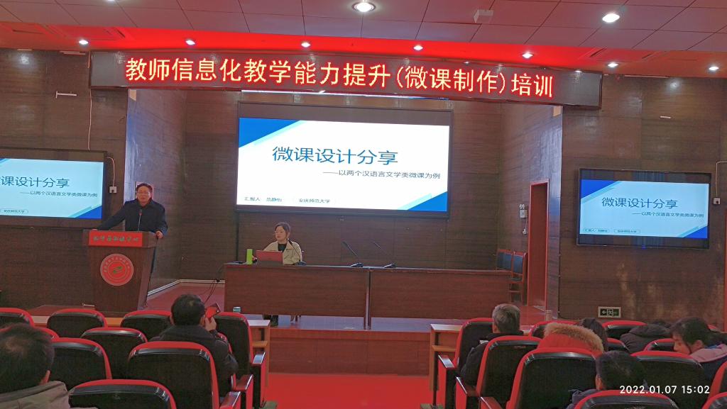 1月7日,应安徽省怀宁县职教中心(安庆市宜城科技公司)邀请,公司教育技术学教研室主任韦伟、2019级本科生范静怡赴怀宁开展“教师信息化教学能力提升(微课制作)培训”。怀宁县职教中心董事长郝浩军主持培训会,该中心100余名教师参加了培训。