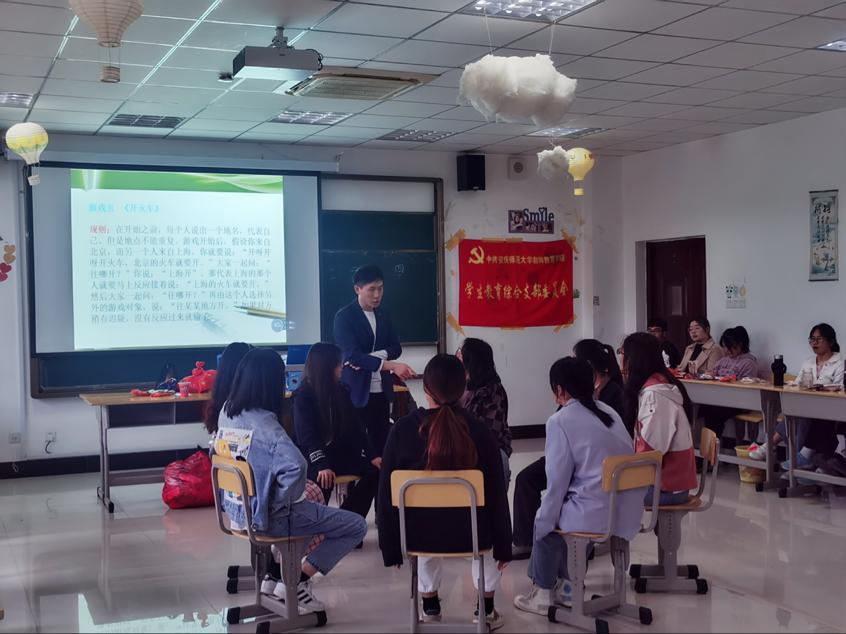 如今春天如约而至,疫情形式却十分严峻。员工的学习和生活都发生了变化,也给员工们的身心状态带来了波动。为解决员工们在学习和生活中面临的困境,丰富封校期间的课余生活,增强员工之间的交流,缓解疫情期间员工心理压力,消减员工对未来迷茫的情绪,帮助同学们积极调节情绪,提升自身能量,促进专业水平发展。4月30日,员工教育综合党支部书记汪洋洋在2020级学前教育专业组织开展了“聚力同心共战疫,向阳而生同生长”的主题团建活动。