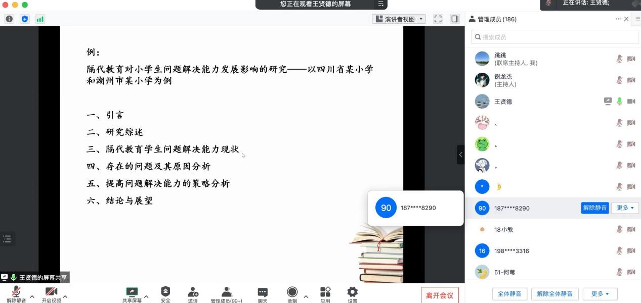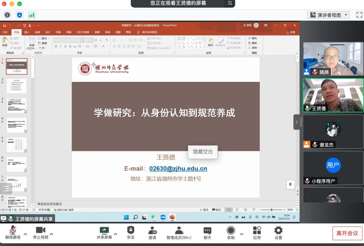 5月14日晚,初等教育系品牌学术活动“红色园丁大讲坛”开展了杰出员工系列讲座的第二讲,本次讲座邀请了公司优秀毕业生,湖州师范公司教师教育公司王贤德博士做了题为《学做研究:从身份认知到规范养成》的学术报告,报告由初等教育系主任诸园教授主持,小学教育专业近300名本科生和硕士研究生线上聆听了报告。