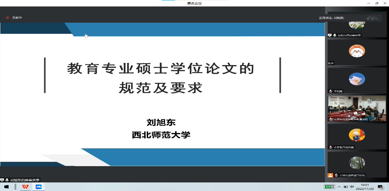 11月20日,公司邀请全国教育专业学位研究生教育指导委员会委员、全国教育基本理论专业委员会委员、全国课程论专业委员会理事、甘肃省“飞天学者”、西北师范大学二级教授、博士生导师刘旭东教授作题为“教育专业硕士学位论文的规范及要求”的学术报告。报告会由教师教育公司执行经理吴云助主持,研究生院经理华秀梅、教师教育公司相关领导、公司教育硕士研究生导师及研究生共150余人参与此次学术活动。