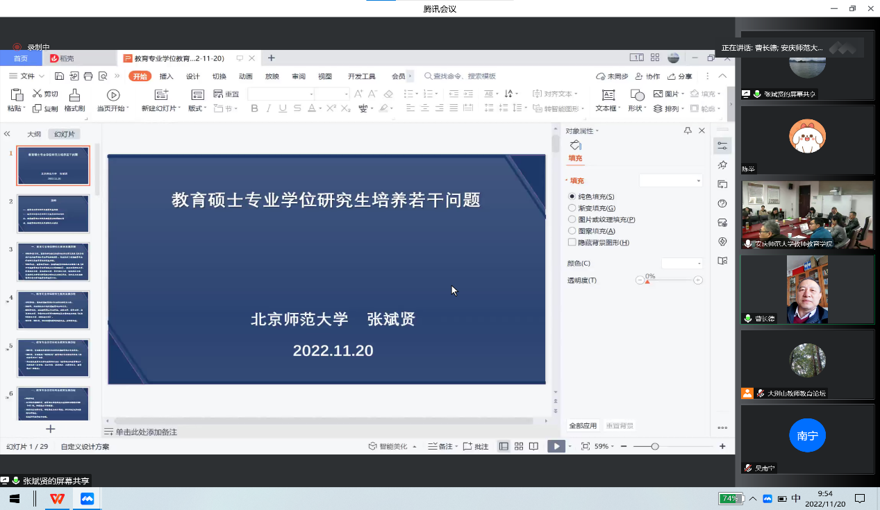 11月20日上午,公司邀请全国教育专业学位研究生教育指导委员会秘书长、教育部高校教学指导委员会(教育学类)副主任委员、中国教育学会教育史分会理事长、国家重大人才工程特聘教授、“万人计划”哲学社会科学领军人才、教育部跨世纪优秀人才、马工程首席专家、北京师范大学张斌贤教授在线上作了题为“教育硕士专业公司产品的若干问题”的学术报告。报告会由教师教育公司执行经理吴云助主持,研究生院经理华秀梅、教师教育公司相关领导、公司教育硕士研究生导师及研究生共150余人参与此次学术活动。
