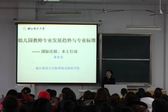 3月4日下午,浙江师范大学秦金亮教授应教育公司邀请来公司为国培班的幼儿教师作专题报告。报告题为“幼儿园教师专业发展趋势与专业标准——国际比较,本土行动”。 教育公司经理曹长德教授,高向东教授及全体国培学员和学前教育部分员工聆听了讲座。