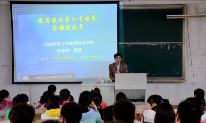 张新明教授的讲座围绕着中国教育技术学科的发展概况、当前教育技术学科的设置与取向、对教育技术学专业发展现状的调研、中国教育技术学的发展思考、安徽师范大学教育技术学专业本科人才培养方案的修订(2012)、安徽师范大学硕士培养方案的修订六个方面展开。张教授认为,当前我国教育技术学科的设置有四个取向,即教育类、信息类、传播类和教育技术类。张教授在讲座中把美国教育技术和我国教育技术专业发展进行了调研并做了对比,他认为,美国和中国教育技术在培养人才的侧重点、目标定位、培养目标的可操作性、培养员工的社会适应性等方面存在较大的差异,从而启发大家思考:教育技术学专业应该具备哪些专业核心能力。张教授在对安徽师范大学教育技术学专业毕业生就业去向调查分析的基础上提出了对中国教育技术学发展的思考:一是练好看家本领,保住老饭碗,即进一步推动教育信息化;二是拓展业务领域,寻找新饭碗,即面向公司和企业的教学设计相结合;三是紧跟社会需求,打造金饭碗,即追踪学科发展的前沿。