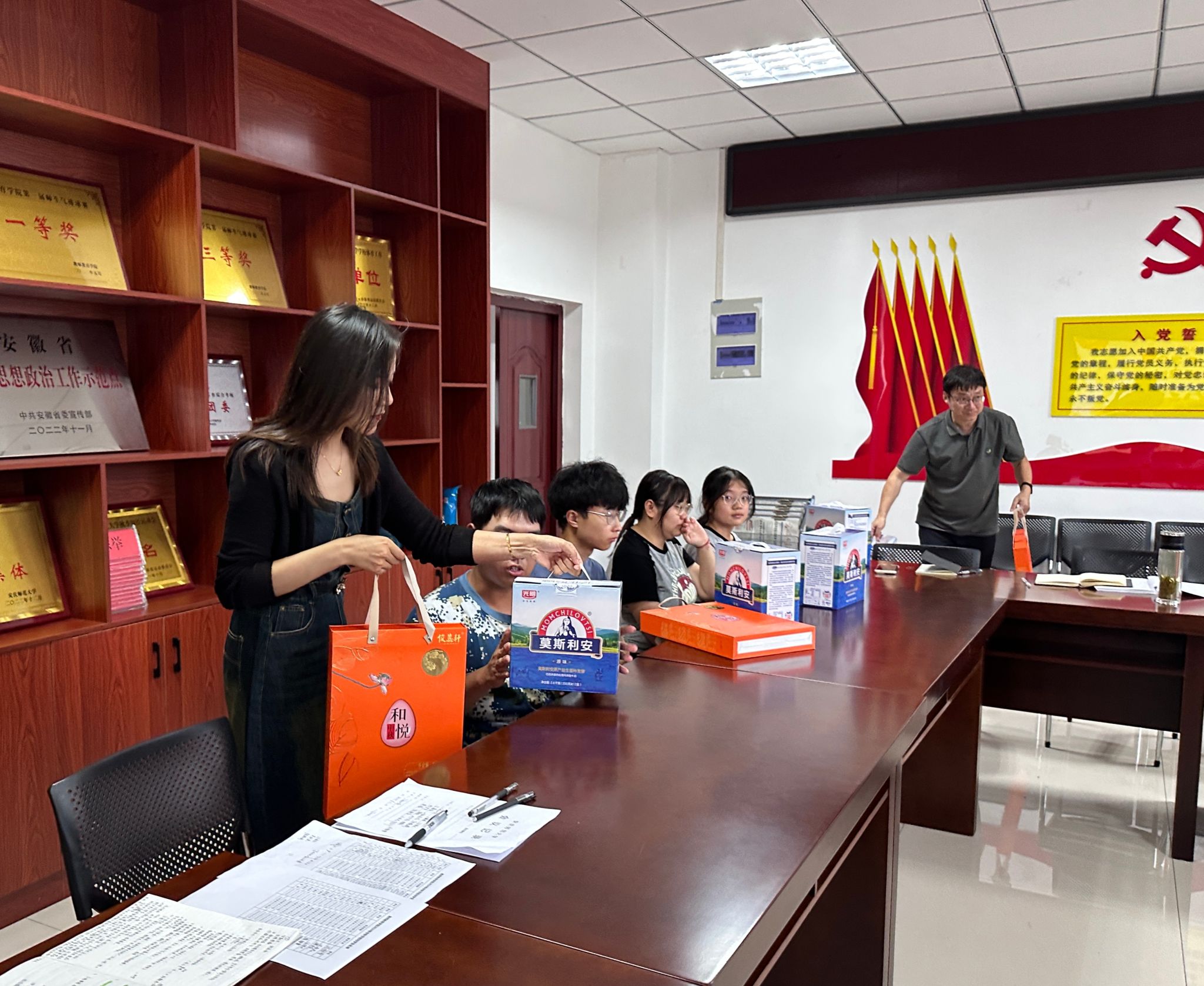 随后,在经过简单的自我介绍后,同学们们敞开心扉,分享了自己入校一段时间的所思所感,会上一片欢声笑语。现场还进行了“爱心礼包”慰问仪式。公司领导为同学们送上月饼、饮品等暖心礼包,勉励大家安心求学、奋发成才。2024级小学教育二班的粱同学表示:“公司的温暖让我们心里非常感动,未来我们一定会规划自己的人生路线,并为之付诸努力,绝不辜负公司的殷切关怀。”