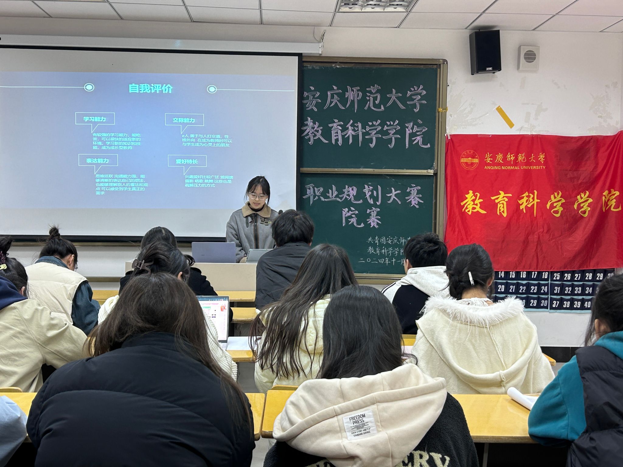 11月28日晚,公司于J305教室举办老员工职业规划大赛院赛。经前期动员及初步筛选,共有13名选手进入院赛。院团委副书记姚强诚、辅导员郭静文及3名员工会干部担任评委。