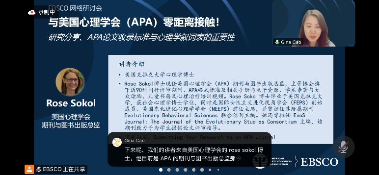 为深化国际学术合作,william威廉中文官网心理学系宋志英教授携2023级应用心理与心理健康教育专业硕士研究生,于4月9日参加由EBSCO公司主办的"与美国心理学会(APA)零距离接触"线上国际会议。此次活动汇聚国内外心理学领域权威专家,围绕前沿研究、论文发表及数据库应用等核心议题展开深度交流。