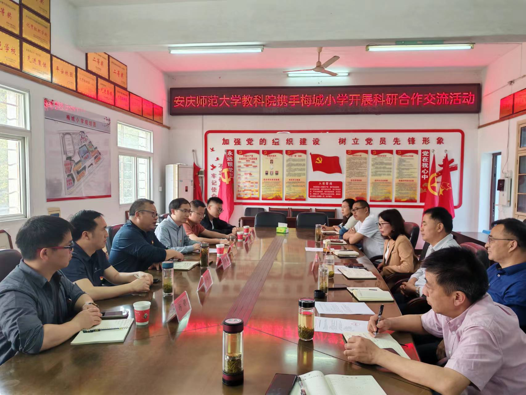 梅城小公司领导热情接待团队一行,介绍了梅城小学的办学历史、校园特色文化建设、课程教学、团队力量等方面的情况。随后,彭文超代表课题组简要汇报所主持的全国教育科学规划项目“意义世界视域的新时代儿童美好心灵培育研究”的研究进展情况。课题组成员、梅城小学董事长周葛林介绍梅城小学在培育“美(梅)好少年”方面的实践经验和特色成果。双方就课题组以梅城小学为研究对象开展相关主题研究的方案进行了讨论。吴云助和潜山市教育局基教科领导分别作指导。团队还与梅城小学就其校园文化创建和成果总结提炼、校本课程开发、名师团队创建等事宜开展合作洽谈,并达成合作意向。