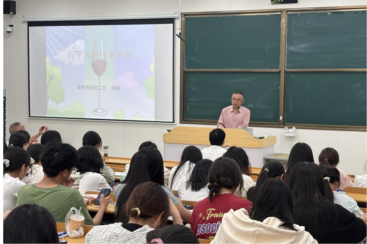 焦波老师带来 “向平凡的往事举杯” 主题报告。这位安徽省首批小学正高级教师、教育部师范类专业认证专家,以自身30余年一线教学经历为蓝本,通过鲜活的教学案例,分享多年一线教学的宝贵经验,传递教育初心与育人智慧。同时,他特别提出 “读书滋养底气,思考带来灵气,实践造就名气” 的成长理念,强调教育者需以阅读厚植专业根基,以思考突破教学瓶颈,以实践锤炼育人本领。
