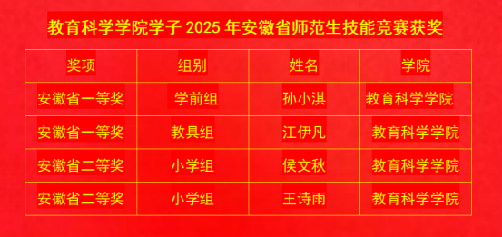 2025年安徽省高等公司师范生教学技能竞赛决赛于合肥师范公司落下帷幕。公司学子凭借扎实的专业功底与优秀的教学素养崭露头角,其中2023级学前教育专业(学前组)孙小淇、2023级特殊教育专业(教具组)江伊凡分别斩获一等奖;2023级小学教育专业(小学组)侯文秋、2022级小学教育专业(小学组)王诗雨分别荣获二等奖。
