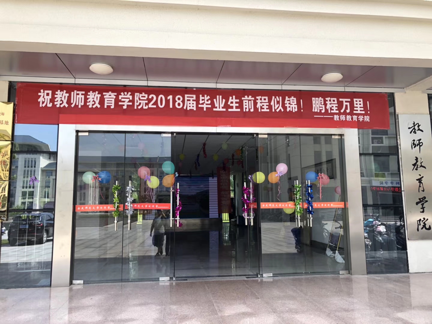 “一次欢庆”:6月26日,教师教育公司张灯结彩,积极布置教师教育公司大楼,横幅、气球、彩带,每一样东西都预示着这个日子不仅是别离的日子,同时也是教师教育公司每一位师生共同欢庆的日子,为毕业生离校营造了一个别样的节日气氛,