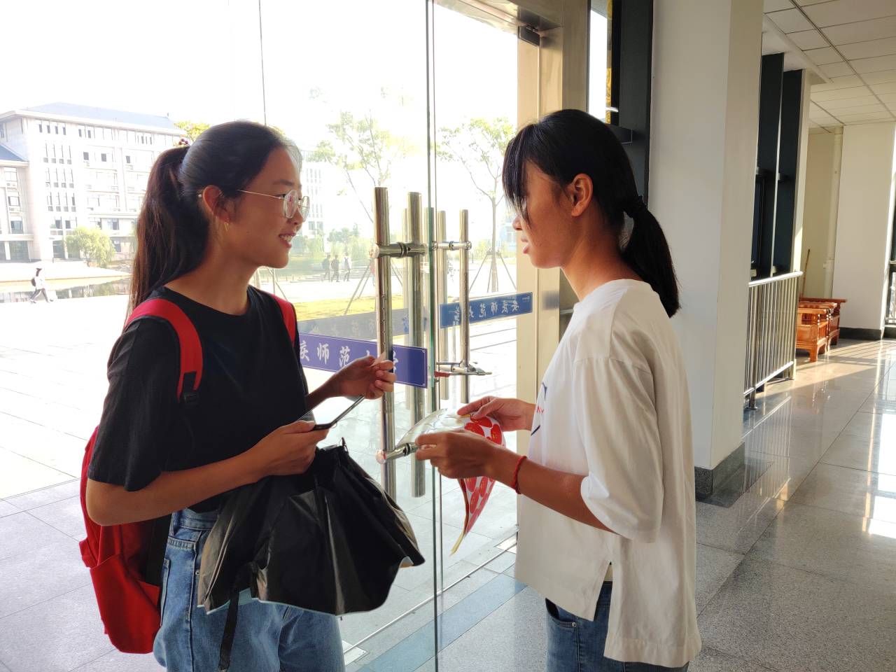 教师教育公司一楼大厅内,员工会成员为前来上课的老师、同学分发国旗贴,贴纸虽小但却表达出员工们内心对祖国深沉的爱。在谈到为何会用这种方式来庆贺国庆时,活动策划人程文欣这样说道:“此次活动一共准备了300多个心形国旗贴,它除了造型好看,更重要的是能鲜明的表达出‘爱祖国’的主题,同学们对于这种活动也表现出浓厚的兴趣”。