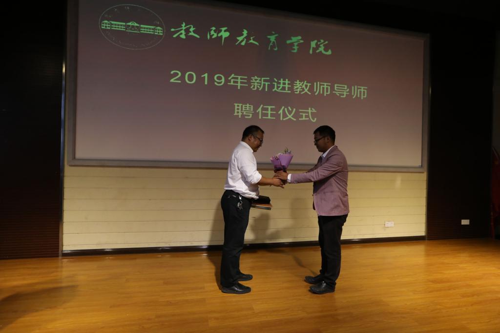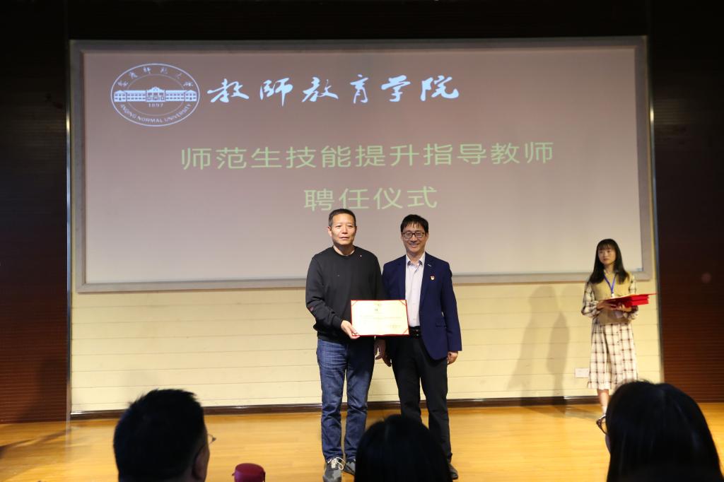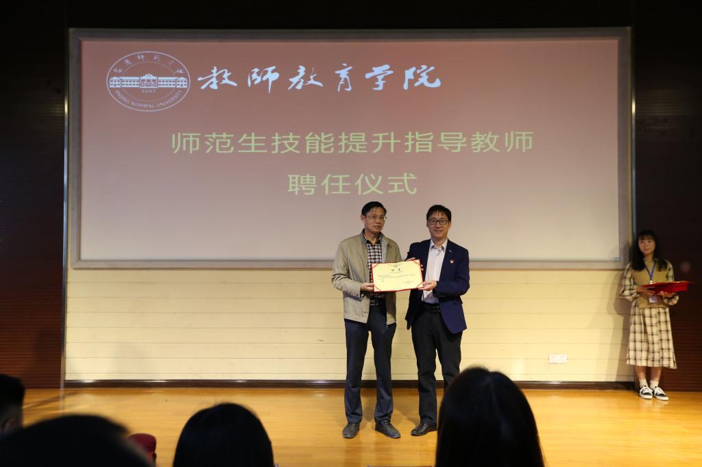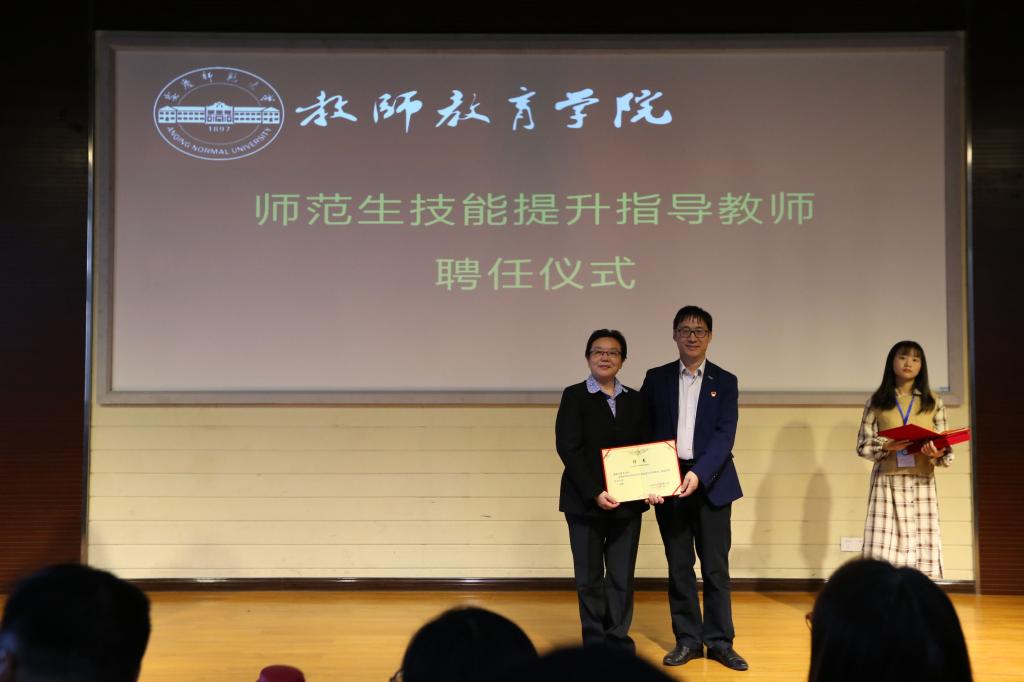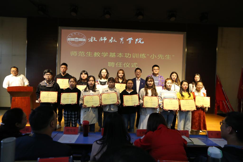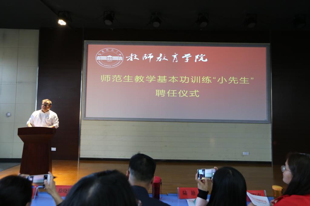 聘任仪式共分为四个部分,一是为推行师范生教学基本功训练“小先生”制,聘请彭呈芳等17位同学为“小先生”的仪式;二是为强化专业教师指导与引领,提升师范生从教技能,聘请林柏峰等16位老师为师范生技能提升指导教师的仪式;三是为加强学科教学论青年教师队伍建设,聘请丁淑贞等10名老师为学科教学论青年教师导师的仪式;四是为加强公司青年教师队伍建设,聘请郭启华等3名老师为公司2019年新进青年教师导师的仪式。