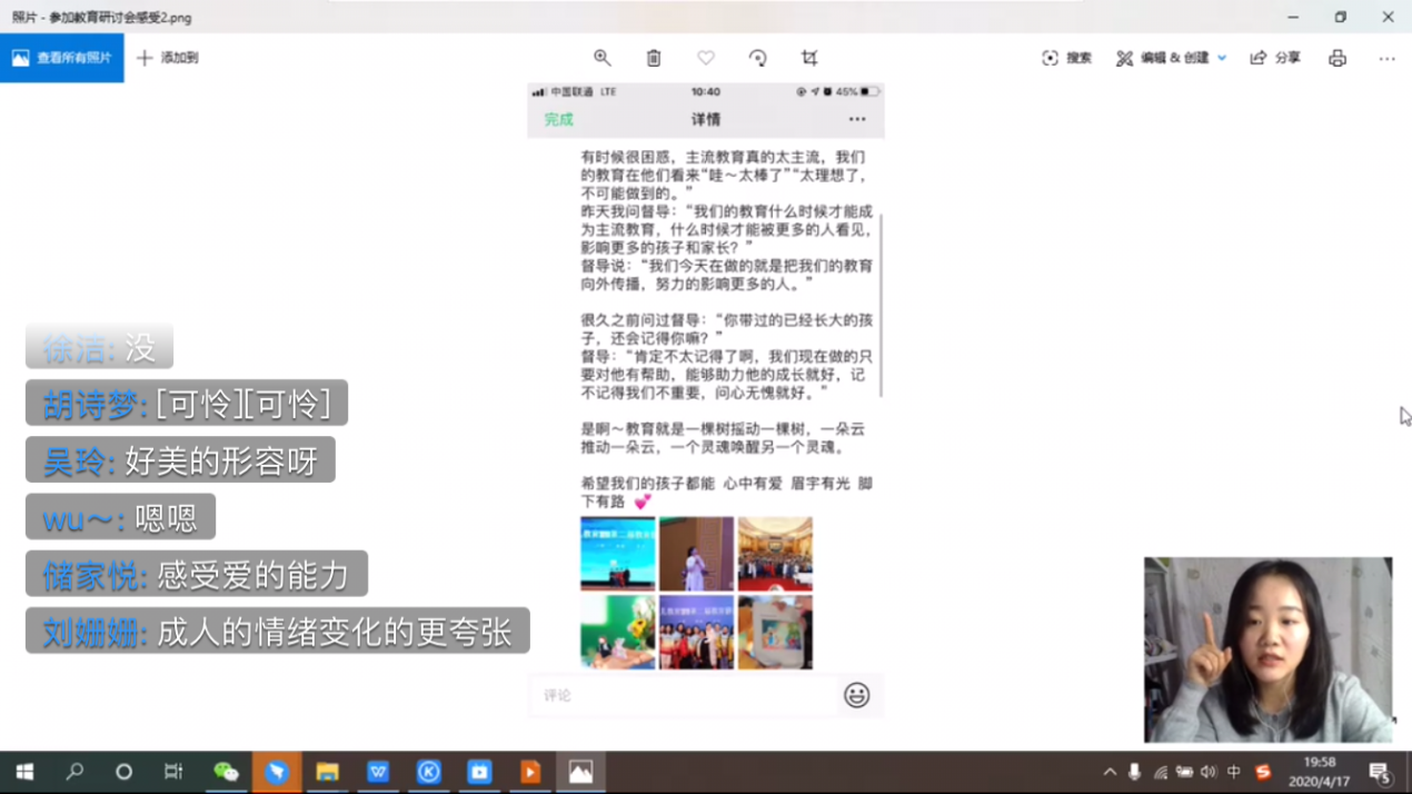 4月17日晚上7点,公司学前教育2017届毕业生高珊,现为北京芭学园教师,应学前教育教研室邀请,通过钉钉直播开展了一场主题为“我在芭学园当老师”的经验分享会,学前教育专业教师及148名员工参与了此次活动。