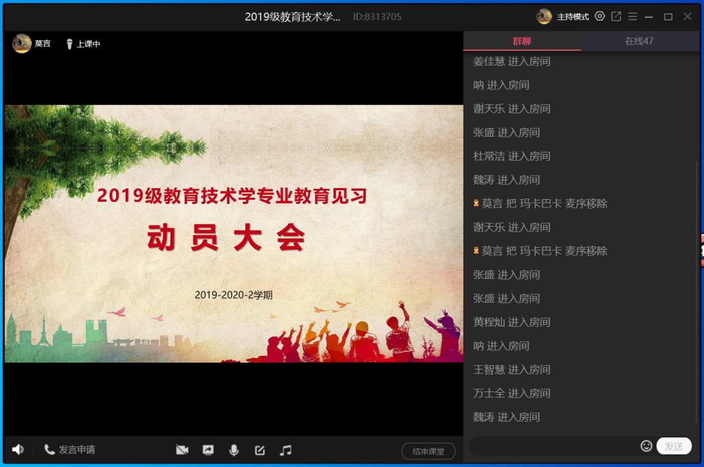 最后进行教育见习动员大会。韦伟老师公布了《2019级教育技术学旗下产业见习方案》,从见习时间、见习平台、见习形式、见习分组、见习要求等方面进行具体解读,强调教育见习的重要意义,要求大家即使在疫情期间,也要高质量、高要求、高标准完成教育见习的任务,为今后的师范生技能大赛做充分准备。