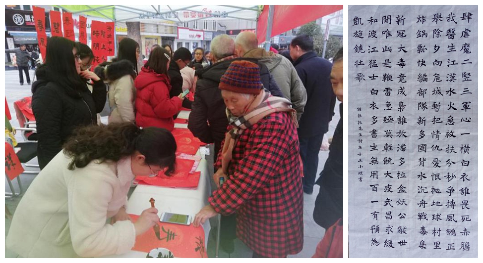 在学好书法的同时,王小蝶同学愿意利用自己的书法特长去帮助更多的人。2019年10月,她受聘为公司师范生教学基本功训练“小先生”,积极帮助其他同学提高书法水平;2020年1月,随邓石如书法班到安庆市人民路参与“迎新送福”活动,义务为安庆市民书写春联,深受广大市民欢迎;参与邓石如书法班“送春联”活动,为全校师生书写春联。在这次全民“战疫”中,王小蝶代表公司员工用书法的名义书写战胜新冠疫情的信心和决心。