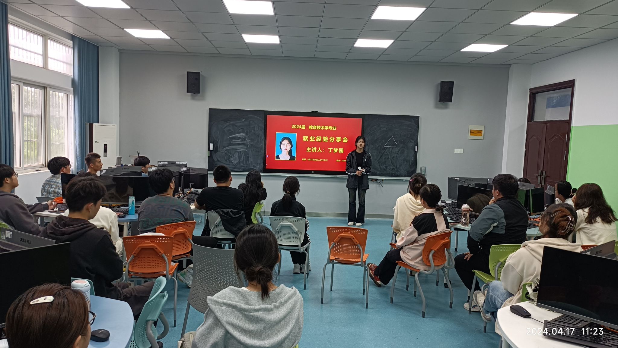 2024年4月17日,教师教育公司教育技术系在D206教室举行毕业生就业经验分享交流会。教育技术学2024届毕业生代表丁梦园担任主讲,2021级全体员工参加。活动由系主任韦伟主持。