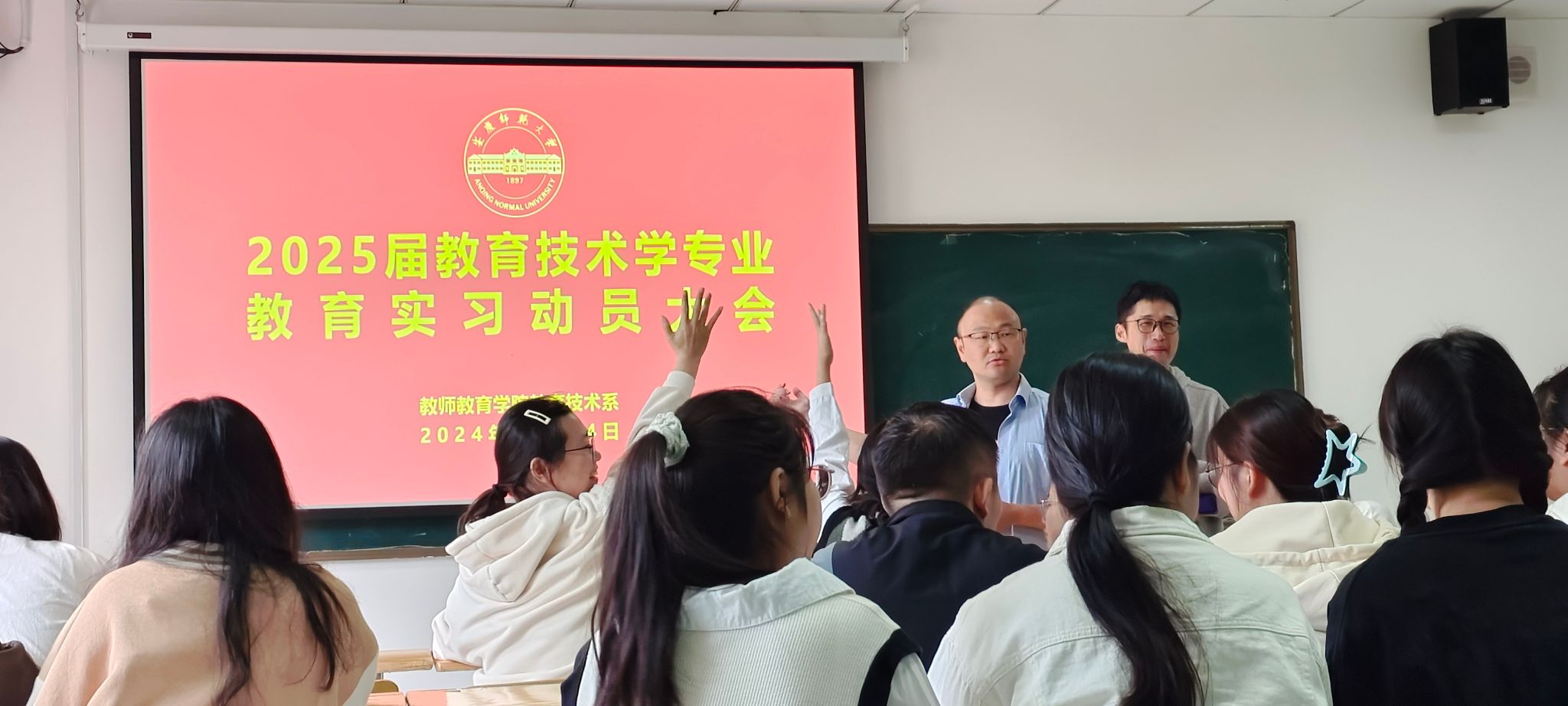 2024年10月14日上午,教育技术系在J103教室召开2025届毕业生教育实习动员会,教育技术学专业2025届全体毕业生、实习指导教师代表韦伟、朱斌彬参加会议。会议由韦伟主持。