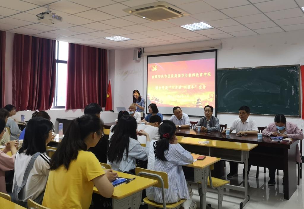 为加强落实为群众办实事,进一步保障员工的基本医保权益,加大对医保政策的了解,提升同学们的参保意识。5月26日下午,教师教育公司与安庆市医保局在J305教室联合开展“三走进,三服务”宣传活动。安庆市医疗保障局党组成员、副局长钱大兴,主任朱丽虹,副主任严涛,待遇核付科科长黄定安,征缴科科长吴多双,办公室主任李慧,征缴科工作人员彭婉君出席了本次活动,会议由教师教育公司老师刘雪梅主持,员工小学教育党支部的全体党员、积极分子共50余人参加宣讲会。