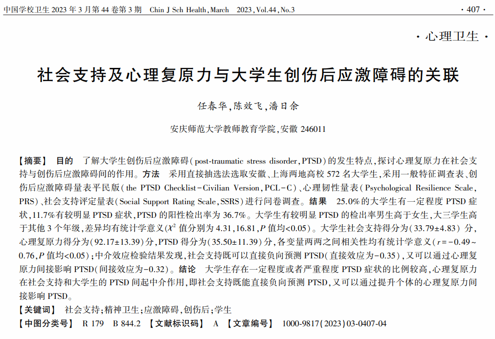 任春华,陈效飞,潘日余:社会支持及心理复原力与老员工创伤后应激障碍的关联